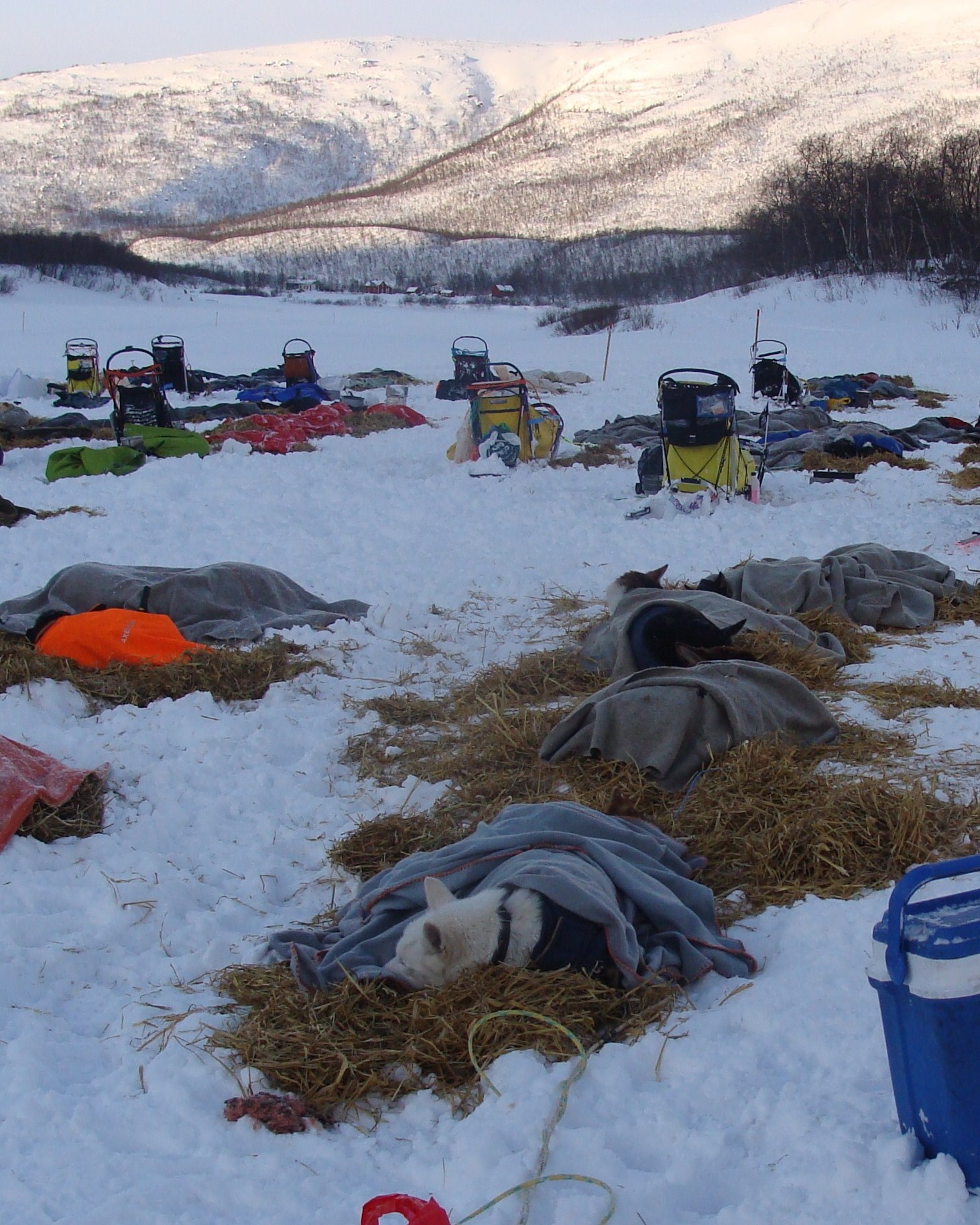 I arrived Checkpoint Levajok on the border to Finland just after first light Sunday morning. The Veterinary team checked the dogs and everything was good. One of the best looking teams so far they told me. I gave the dogs food, gave them massages, and put them to sleep on a thick layer of straw, with blankets covering them.